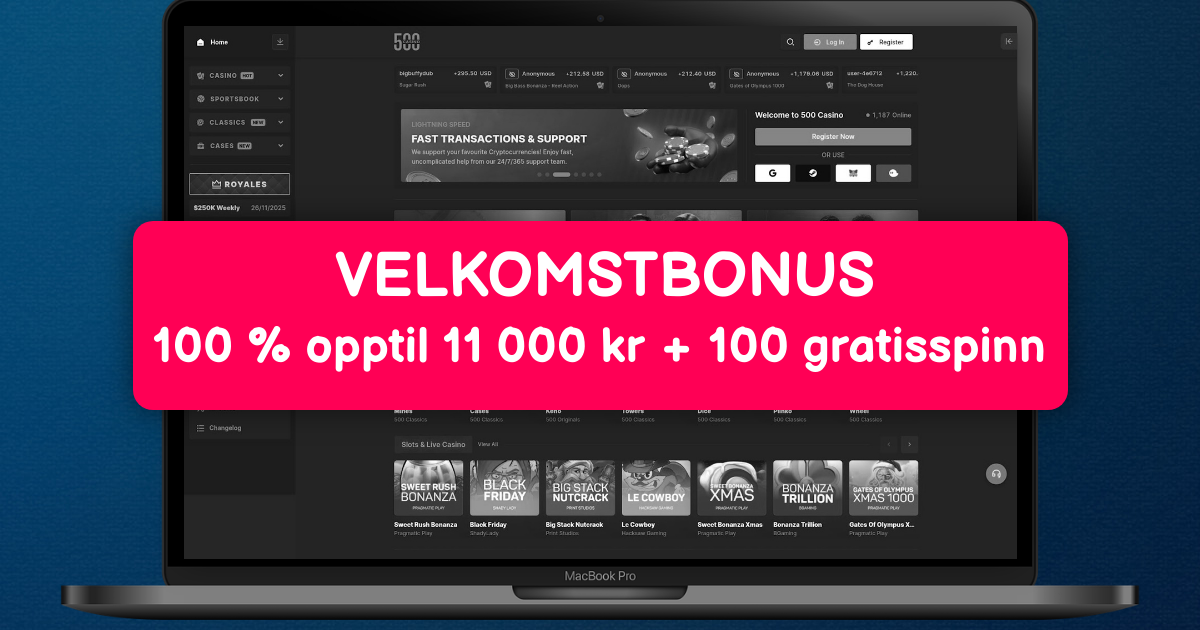 500 Casino ønsker deg velkommen til en verden av spenning og gevinster rett fra Norge. Med vår generøse velkomstbonus på opptil 5000 kr i NOK, kan du kickstarte eventyret ditt umiddelbart. Denne bonusen kommer med rimelige omsetningskrav på 35x, slik at du raskt kan nyte gevinstene. Som et lisensiert casino under Malta Gaming Authority, tilbyr vi trygge og rettferdige spillopplevelser for alle norske spillere. Nyt fordeler som lynraske utbetalinger innen 24 timer, døgnåpen kundestøtte på norsk og en brukervennlig plattform. Vårt brede utvalg inkluderer tusenvis av spilleautomater, immersive live casino-bord og klassiske bordspill som rulett og blackjack. Vi samarbeider med toppleverandører som NetEnt, Pragmatic Play og Evolution for å levere høy kvalitet og innovative funksjoner, inkludert live casino Norge med ekte dealere. Spill sømløst på mobilen vår, enten via app eller nettleser, uten å gå glipp av noe. Sett inn penger trygt med metoder som Visa, Mastercard, Skrill og bankoverføring, og ta ut gevinster raskt med vår rask utbetaling casino-service. Slots bonus tilbyr ekstra spinn på populære titler, perfekt for norske spillere som søker store jackpoter. Bli med i dag og opplev hvorfor 500 Casino er det ultimate valget i Norge.